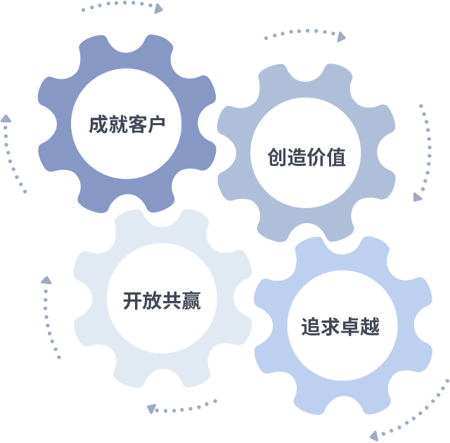 成就客户是一切决策的出发点,,,创造价值是衡量所有工作的标准,,,追求卓越是我们做事做人的态度,,,开放共赢是我们的格局也是最终的结果。。价值观的齿轮环环相扣,,,推动着组织里的每个人不断向前。。。。
